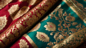 * Zari and Brocade: The defining feature of a Banarasi saree is its intricate brocade and zari work—the use of fine gold and silver threads to create elaborate designs. This technique was refined by weavers who migrated to Varanasi from Gujarat during a famine in the 17th century. They brought with them their weaving skills, which merged with the local traditions.